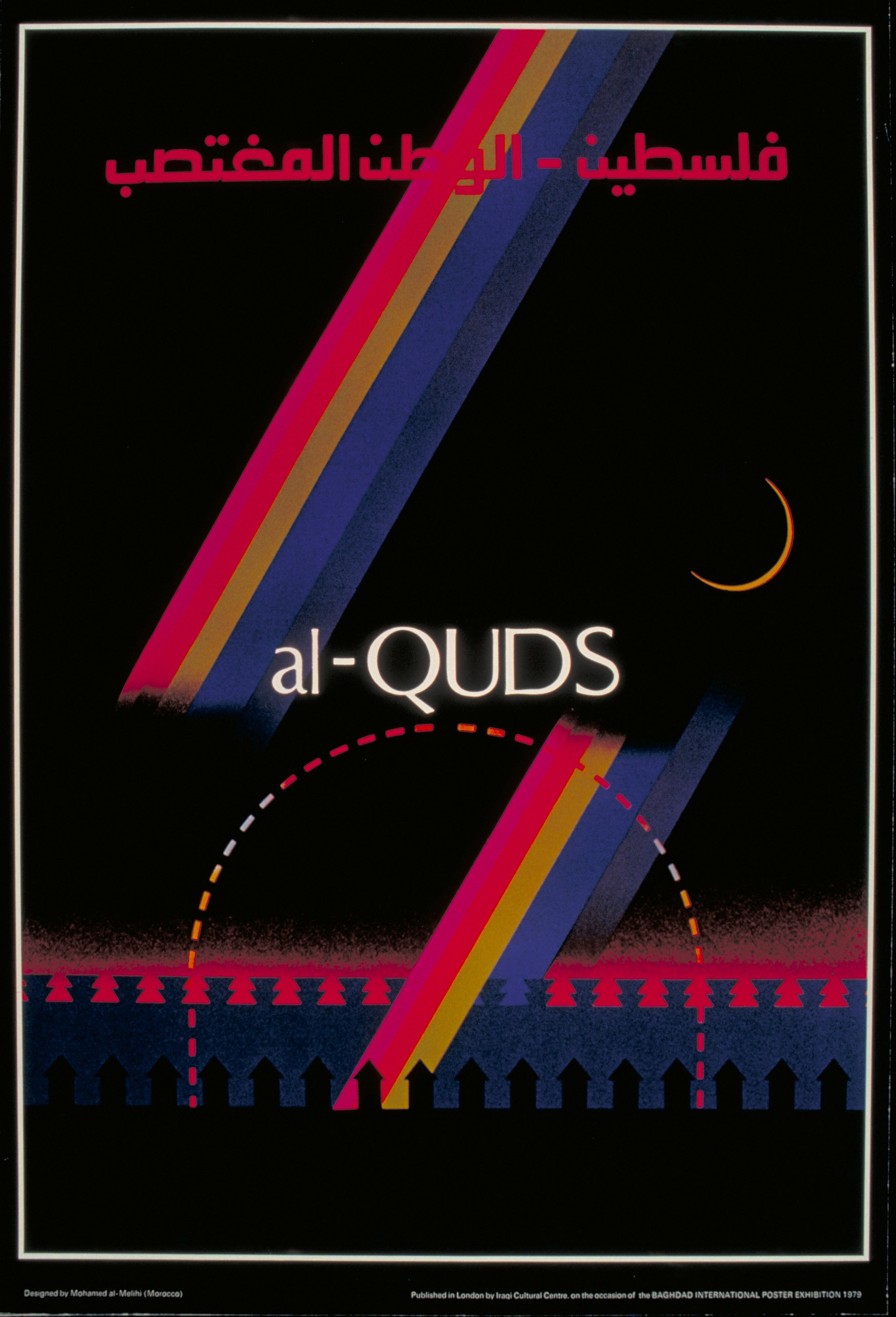 كُتب اسم القدس في منتصف الملصق، بخط أبيض عريض. ويرمز الخط المنحني المتقطّع، في أسفل منتصف الصورة، إلى مسجد قبة الصخرة، ثالث المواقع الأكثر قدسيّة عند المسلمين، بعد مكة المكرمة والمدينة المنورة. والمدينة نفسها ممثَّلة بجدارين مختلفين لهما شكل جدران الحصون، يشيران للعصور المنفصلة في تاريخها المضطرب. ويمثّل القوس الساطع حول حافة القمر الهلال الإسلامي. وفي الملصق الأصلي، يكون رسم القمر بأكمله مرئياً، مما يدل على أن الإسلام هو جزء من تاريخ المدينة وليس كلّه.